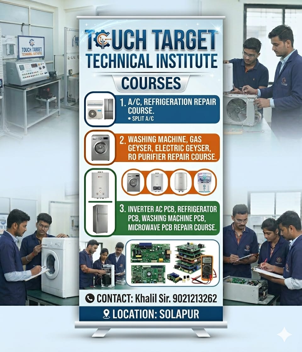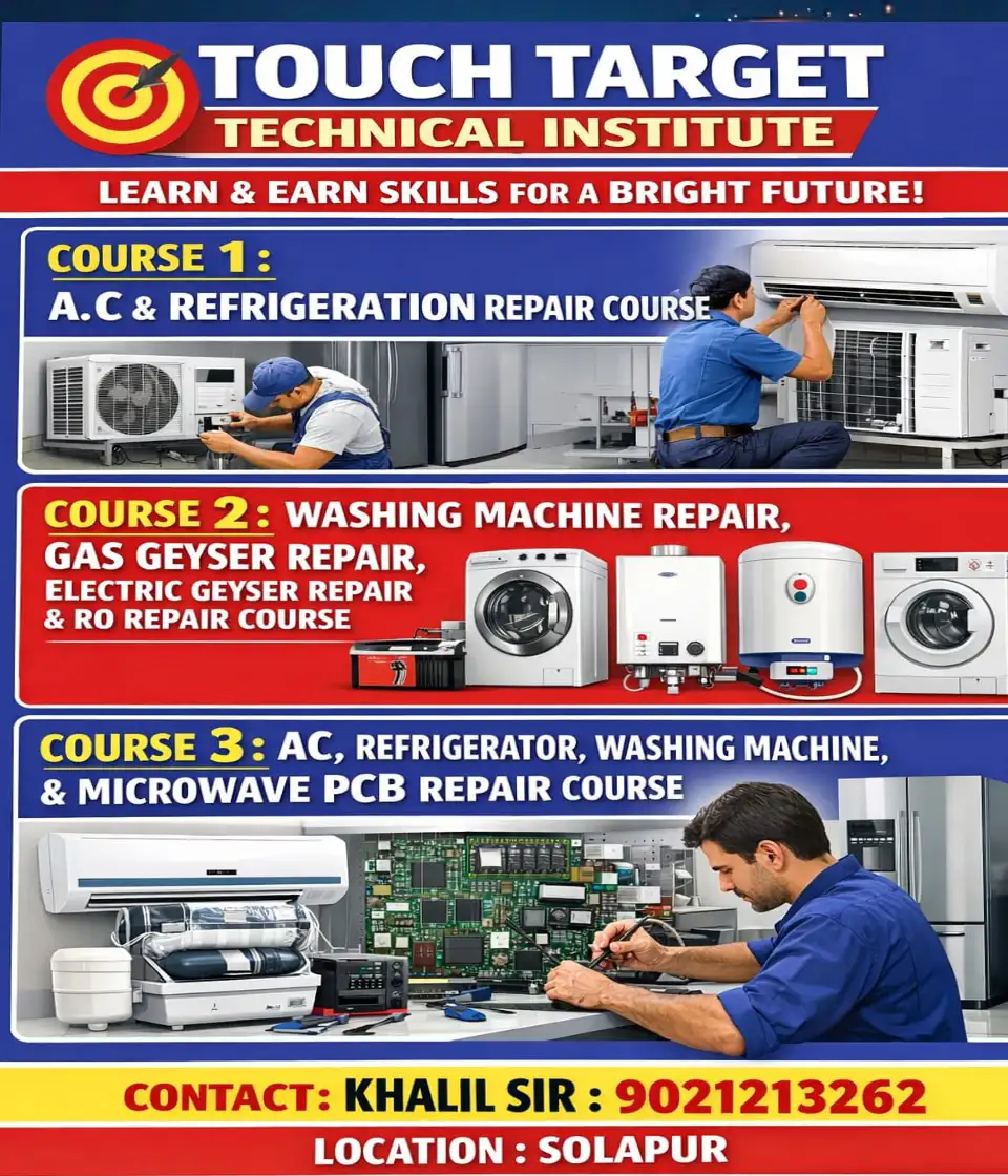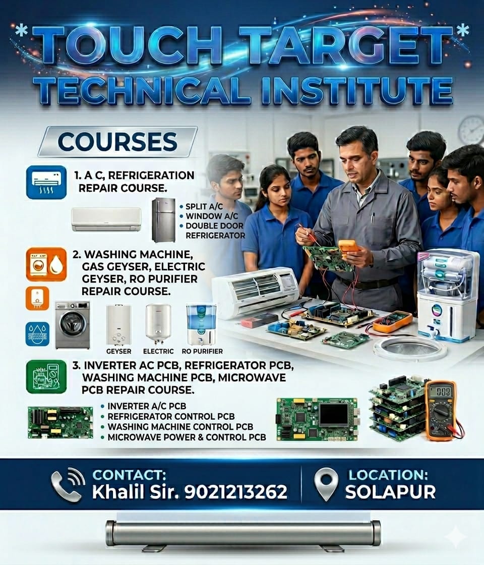 Join the best AC and home appliance repair training institute in Solapur and build a successful career in the technical field. We offer professional courses in AC repair, inverter PCB repairing, refrigerator servicing, washing machine repair, RO system repair, and microwave servicing.
